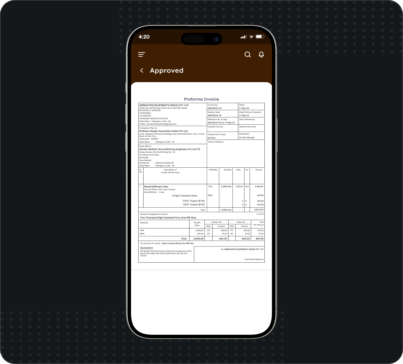 Your sales reps don't need to call the office to ask for a "Kaccha bill" or estimate. Using the Effortless Sales App, they can generate a professional Proforma Invoice right at the customer’s doorstep (if you desire, set-up an approver/checker) for it.