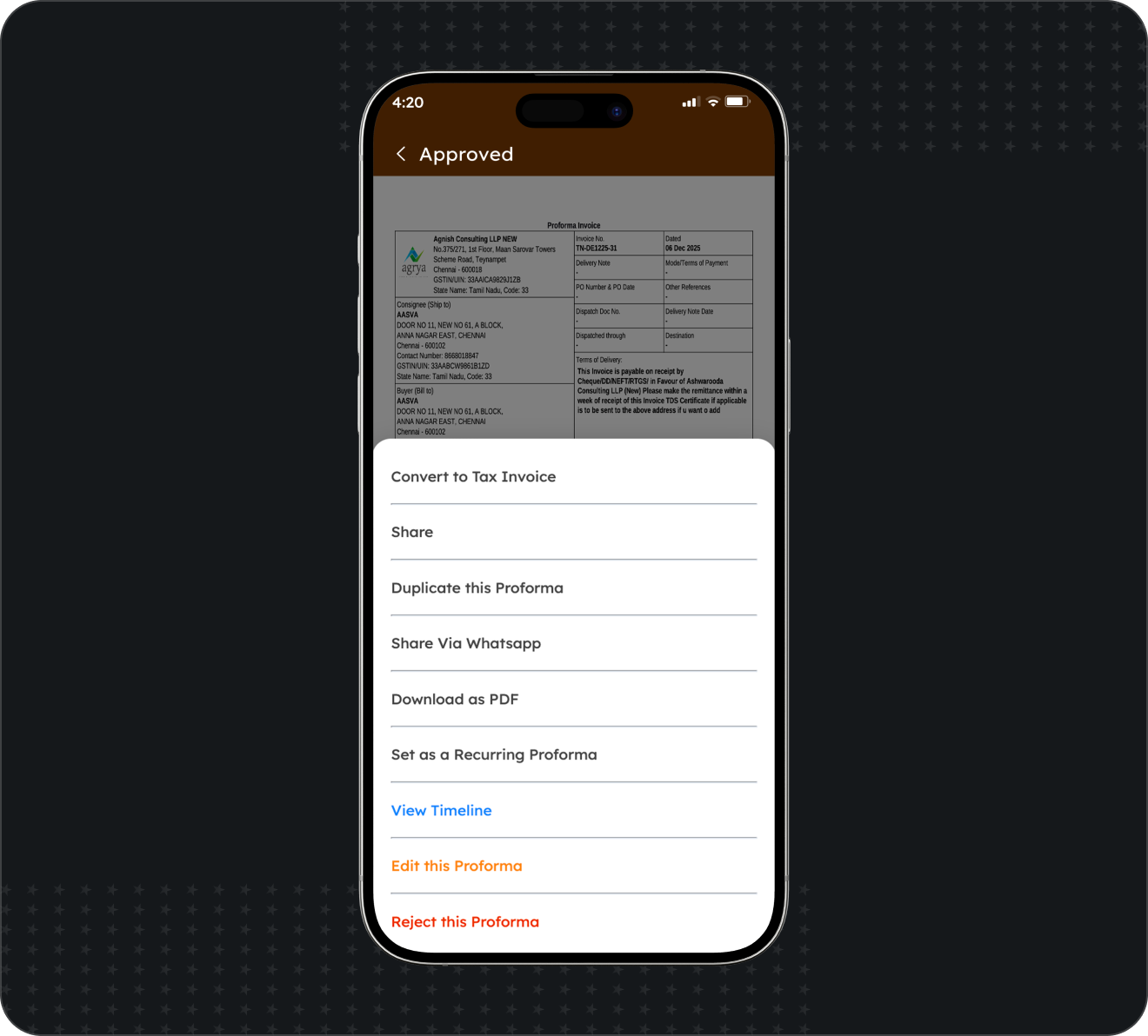 Auto-Conversion: In the Effortless dashboard, the Proforma is converted to a Tax Invoice with one click.