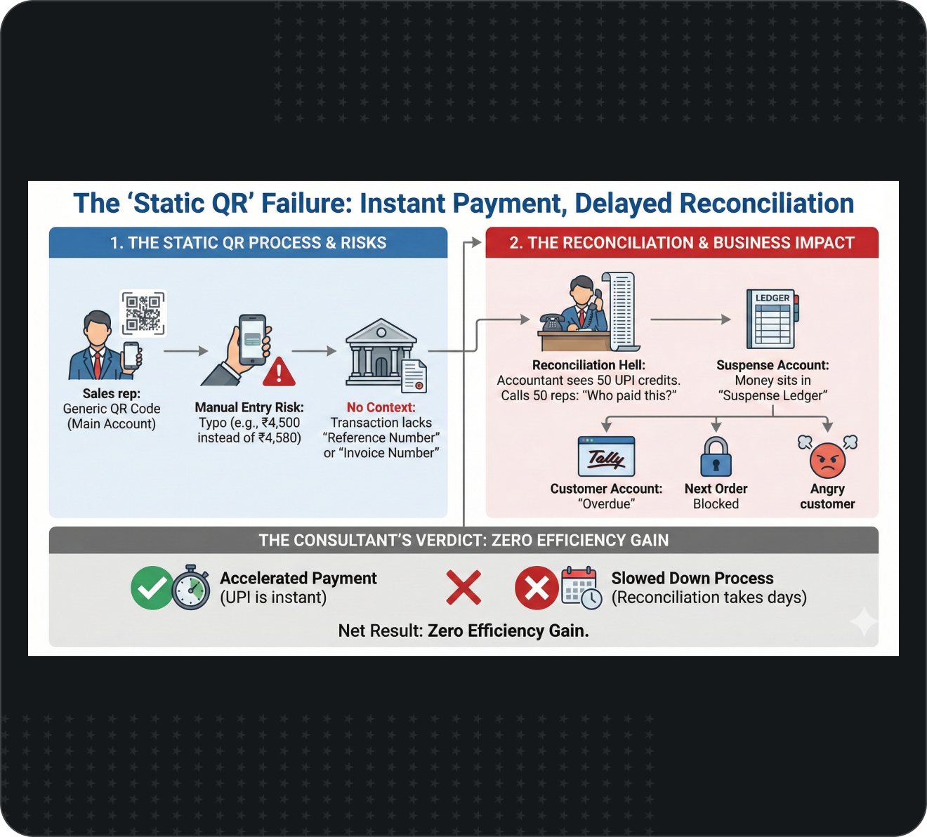 You accelerated the payment (UPI is instant), but you slowed down the process (Reconciliation takes days). Net result: Zero efficiency gain.