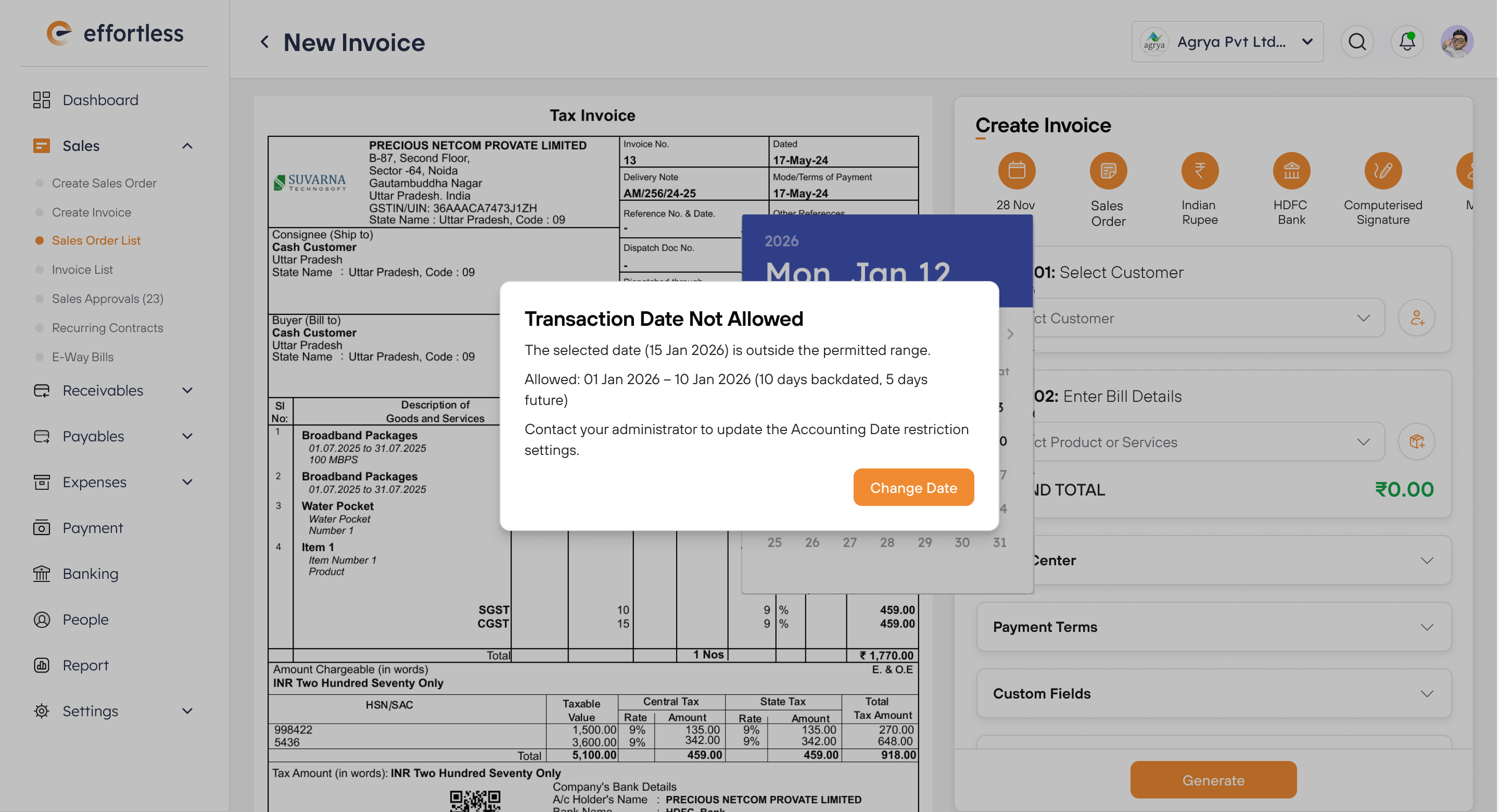 The Effortless Response: A hard error pop-up appears: "Transaction Date Not Allowed. The period is closed."