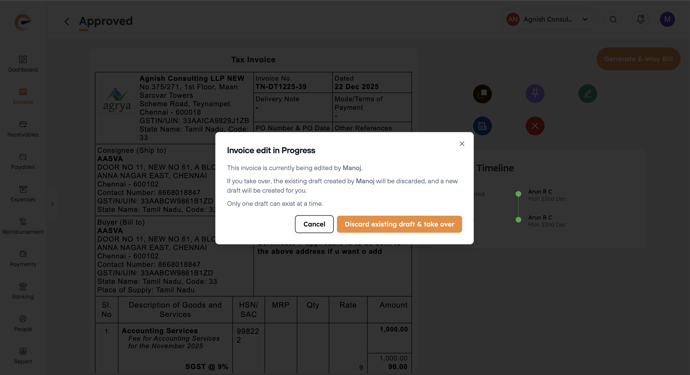 The Lock: If User B tries to open the same invoice, they get a pop-up: "This invoice is currently being edited by [User A]."