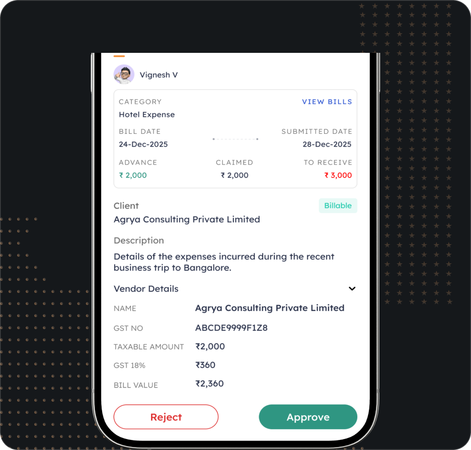 Employees upload travel, food, and petty cash bills from the mobile app.