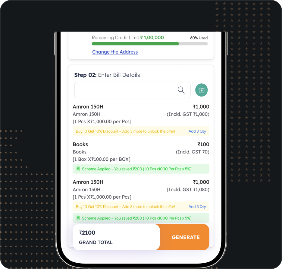 Buy 10 Get 1? 5% Discount on Cash? The app auto-applies schemes based on your Tally logic. No rep calculation errors.