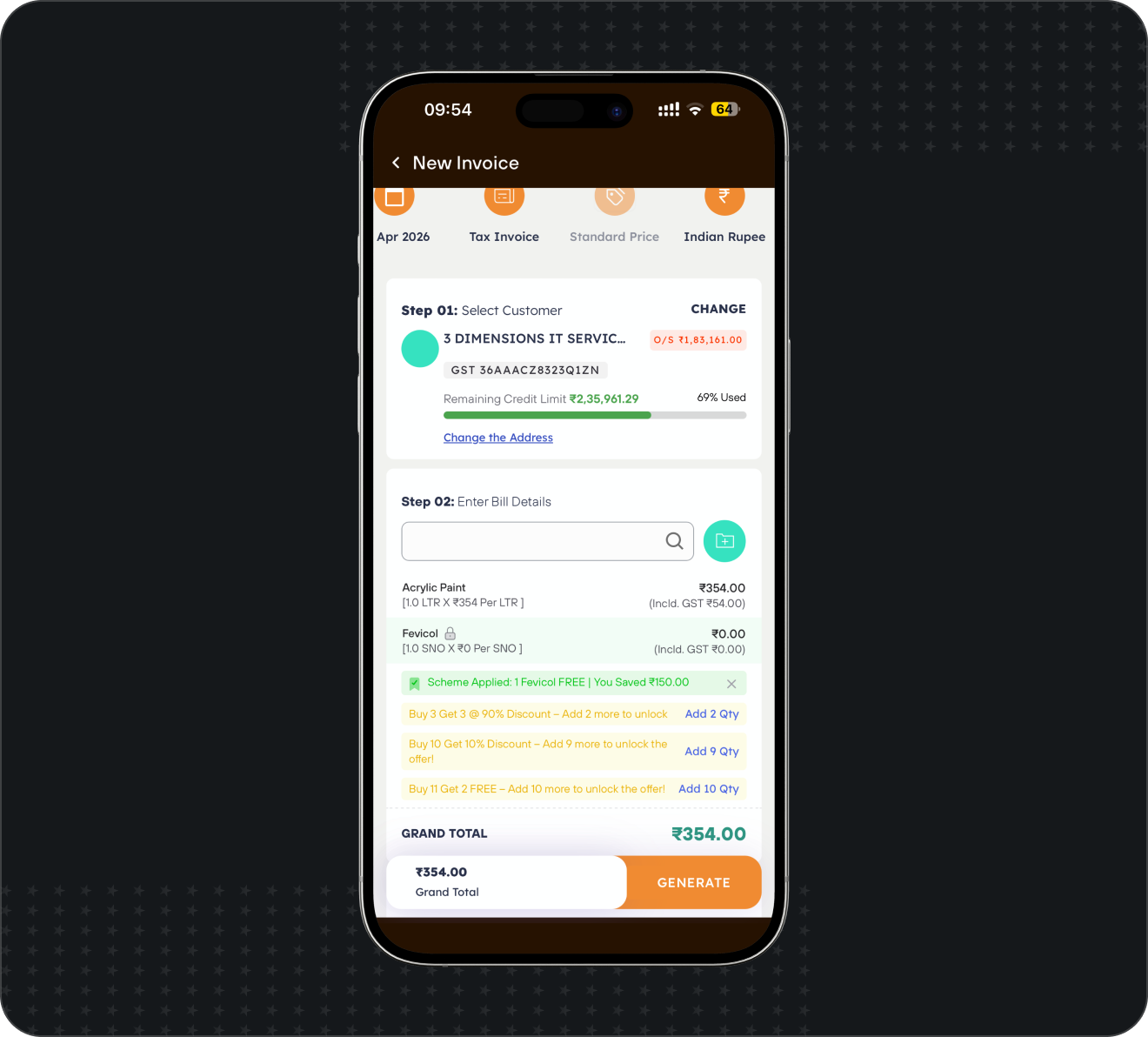 The Scheme Engine: The app shows active, approved schemes: "Buy 50 units, get 2% off."