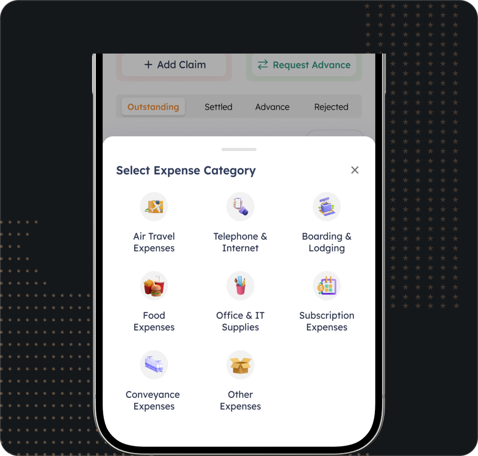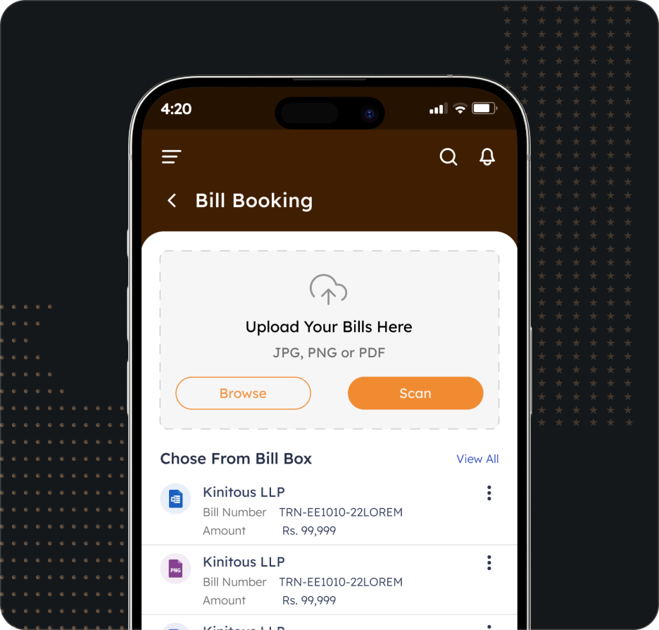 Employees upload travel, food, and petty cash bills from the mobile app.