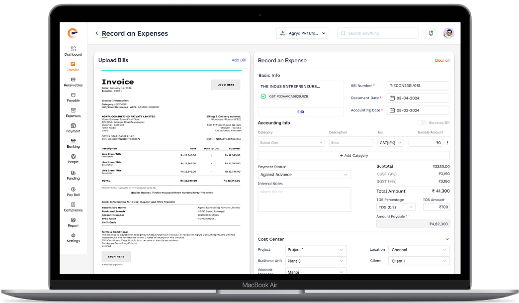 Extracted: GSTIN, Vendor Name, Line items, Tax amounts, Bank Details & Validates with GSTN, TDS Applicability, RCM Applicability, Bank Validation