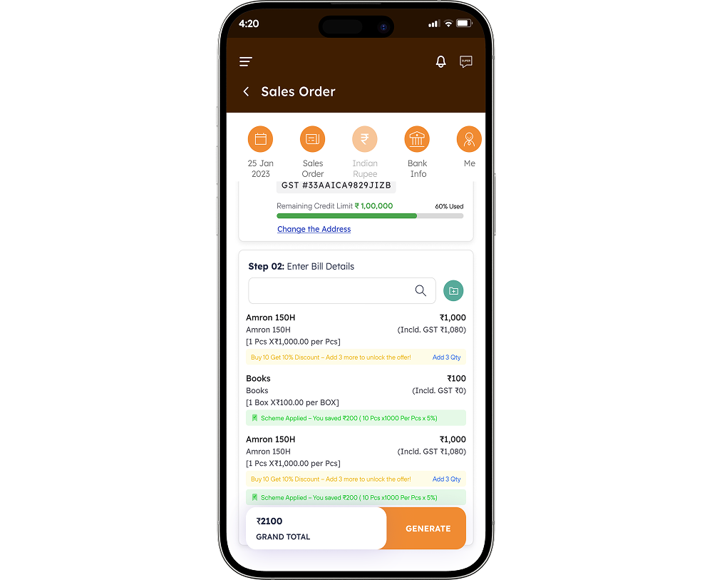 Buy 10 Get 1? 5% Discount on Cash? The app auto-applies schemes based on your Tally logic. No rep calculation errors.