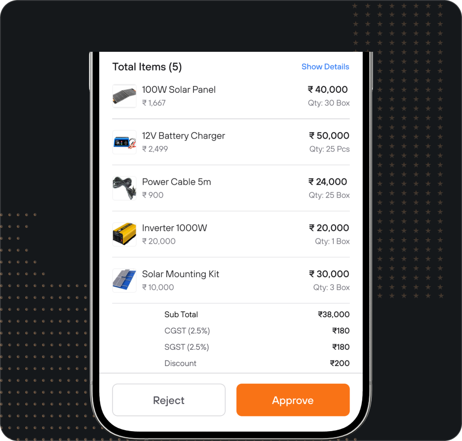 Approved orders convert to e-invoices and sync to Tally as sales vouchers instantly.